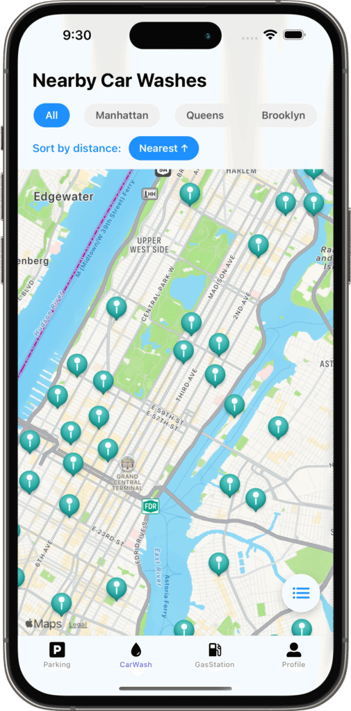 See nearby parking, gas stations, and car washes with filters and distance sorting.